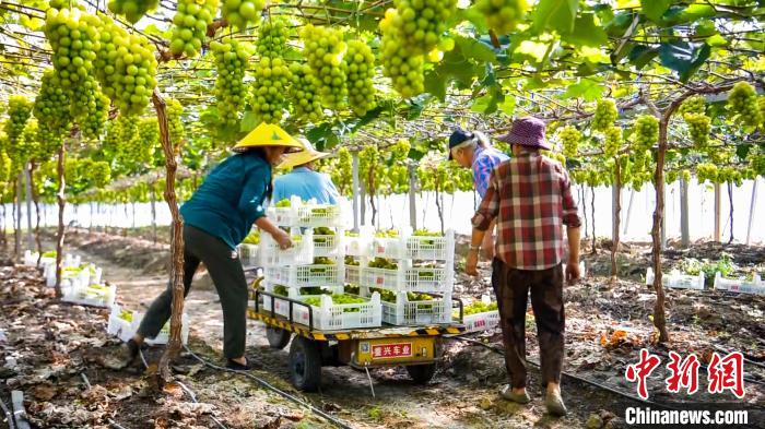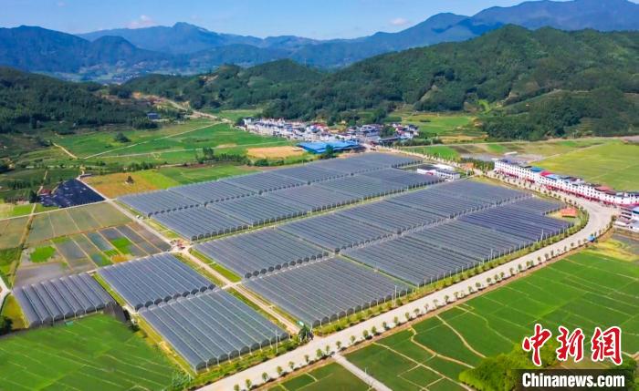 中新网南平7月28日电 (张丽君 黄杰敏 郭斯杰)正值葡萄成熟的好时节,位于福建省南平市政和县东平镇盛庭农场的近300亩阳光玫瑰葡萄陆续成熟,迎来大丰收。连片的现代化农业大棚错落有致分布在田野上,一排排蓝色光伏板在太阳照射下熠熠生辉。