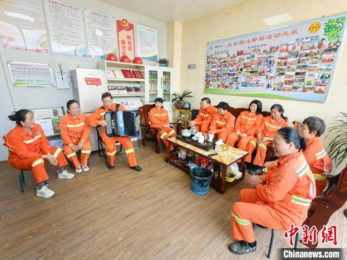图为环卫工人在驿站内休息、娱乐。 中新网记者 林永传 摄