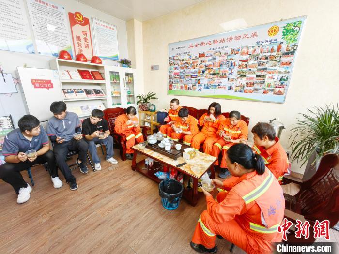 图为环卫工人和快递小哥在驿站内喝免费绿豆汤。 中新网记者 林永传 摄