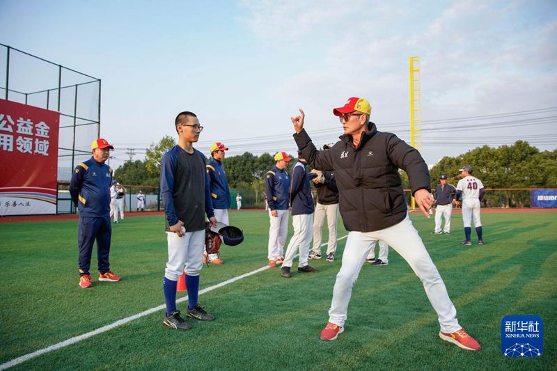 图为台湾教练余文彬与福建省棒球队的球员一起,为青少年棒球运动员开展现场教学。新华网 蒋巧玲 摄